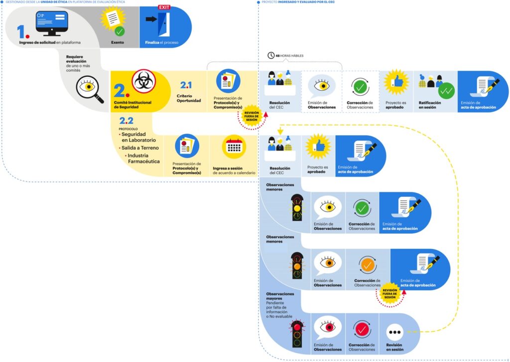 Es responsabilidad de los investigadores presentar la documentación con antelación y cumpliendo con todos los documentos de acuerdo con la naturaleza del estudio. Es importante, estimar los tiempos destinados a la evaluación del proyecto propiamente tal por parte del Comité, instancias necesarias para que el CEC pueda emitir una resolución respecto a la investigación.