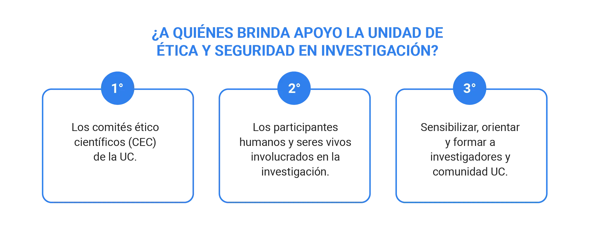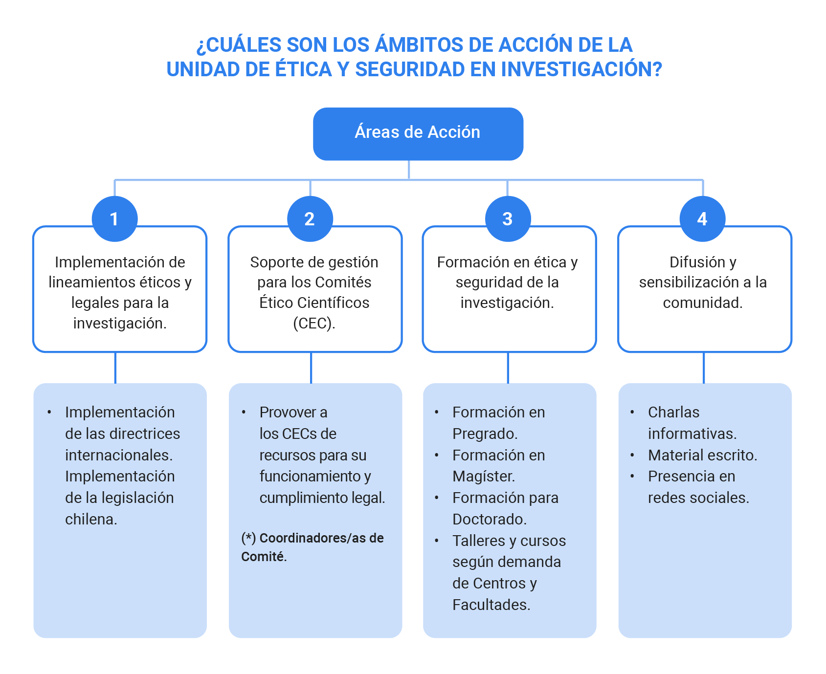 De esta forma, la Unidad apoya a los Comités en velar por el cumplimiento de la correcta conducción de las investigaciones de la universidad y es responsable junto a los Comités, de generar estrategias de formación y capacitación en Ética y Seguridad de Investigación para los miembros de la comunidad universitaria.